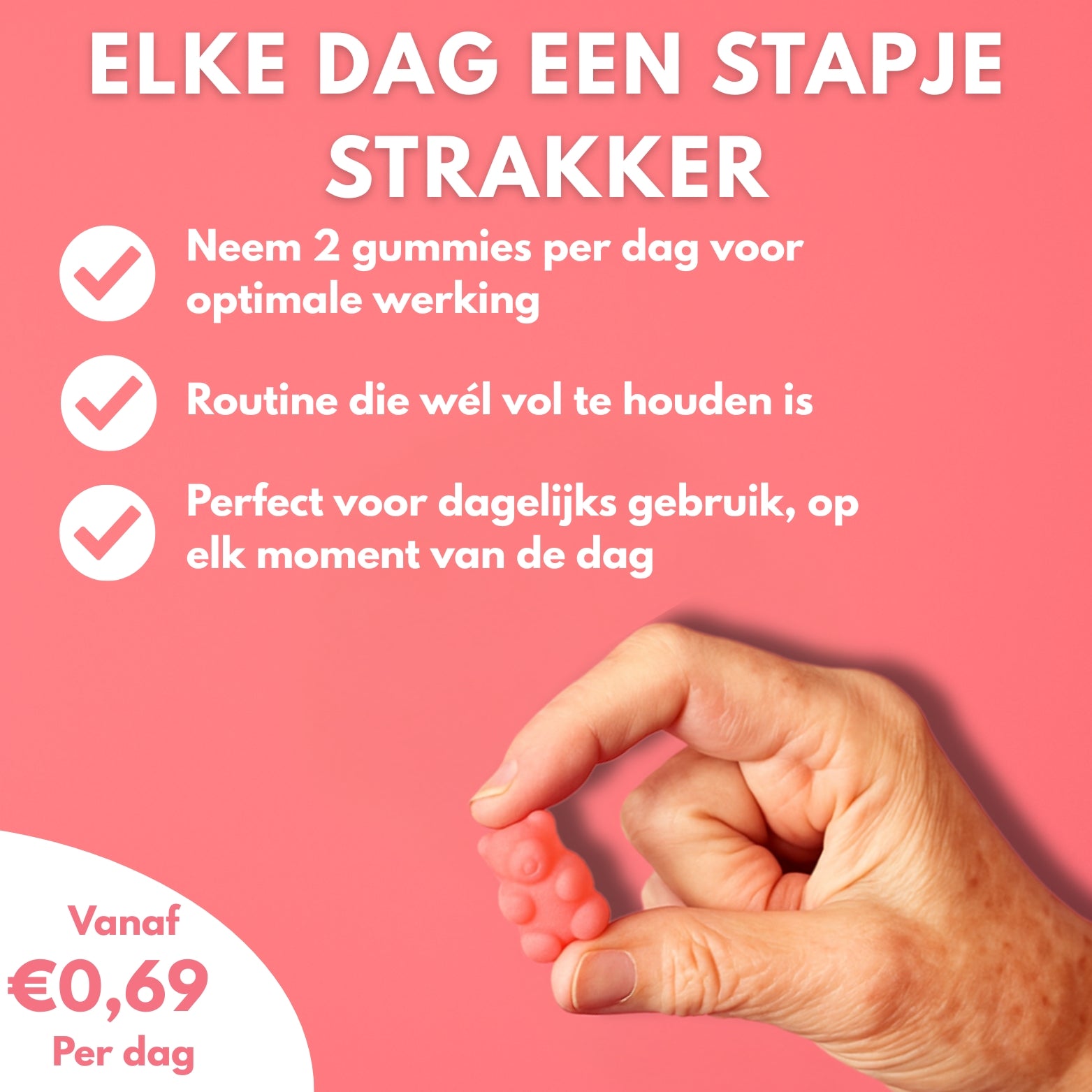 Het zou kunnen, maar het is echt niet nodig. De formule is zo samengesteld dat je lichaam het beste reageert op 2 gummies per dag. Een hogere dosering geeft geen sneller of beter resultaat en is daarom niet aanbevolen. Consistentie is veel belangrijker dan hoeveelheid. Dagelijks 2 gummies is precies wat je nodig hebt om de ingrediënten optimaal hun werk te laten doen.