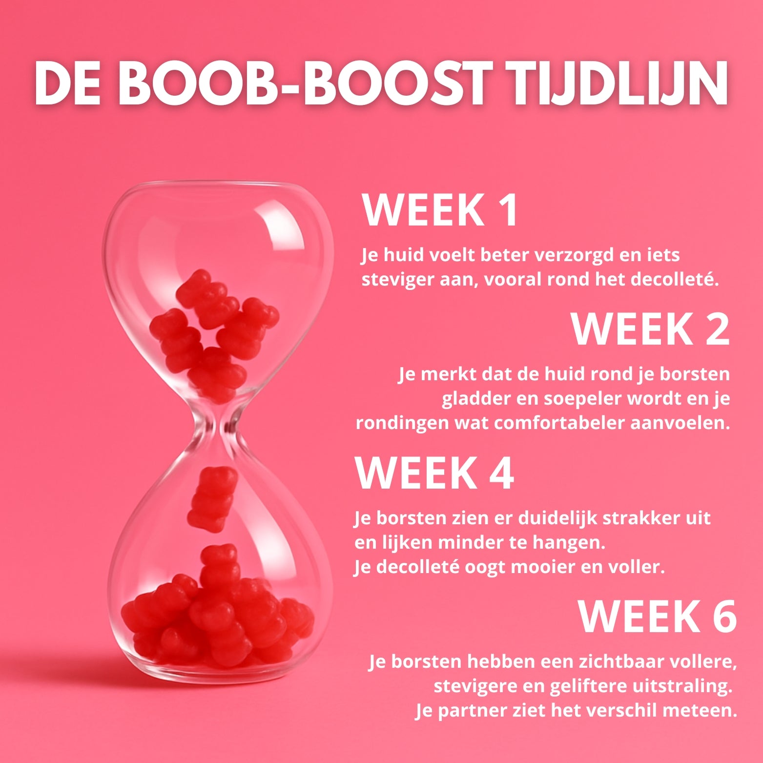Ik gebruik de gummies nu een paar weken en merkte al snel dat de huid rond mijn borsten zachter en beter verzorgd aanvoelt. Inmiddels lijken ze echt mooier in vorm en minder hangend. Het voelt fijn om weer wat meer vertrouwen te hebben in hoe mijn decolleté eruitziet.