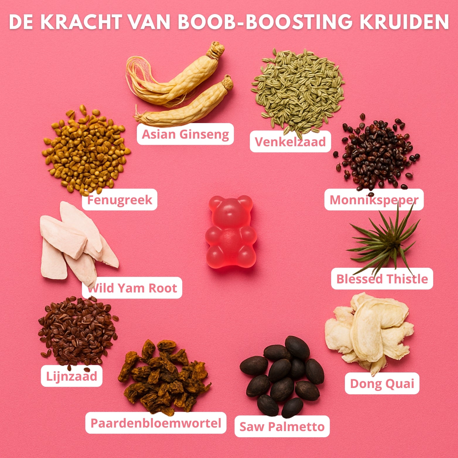 Vitamine C ondersteunt de natuurlijke collageenvorming van de huid, terwijl kruiden als fenegriek en venkel traditioneel worden gebruikt voor een voller gevoel in vrouwelijke rondingen. Dong quai en monnikspeper worden al generaties lang ingezet om vrouwen te ondersteunen in hun natuurlijke hormonale balans. Wild yam en blessed thistle staan bekend om hun bijdrage aan vrouwelijk weefselcomfort.